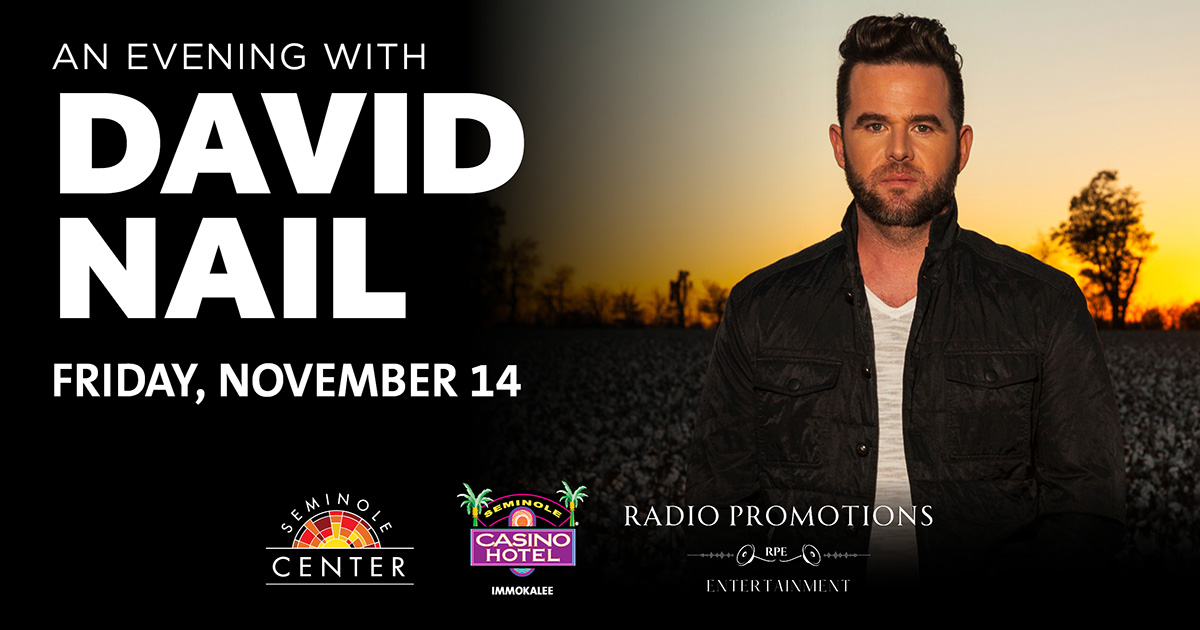 Radio Promotions Entertainment presents Multi-platinum singer/songwriter David Nail live in concert at Seminole Casino Hotel Immokalee Friday, Nov. 14 with doors opening at 7 p.m. and the show beginning at 8 p.m. Tickets start at $59, are available now from Ticketmaster or at www.moreinparadise.com. Parking is free.