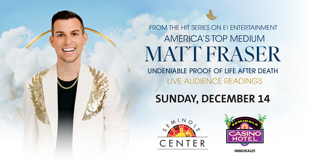 IMMOKALEE, Fla. – Matt Fraser, America’s Top Psychic Medium and star of the hit television series on E! Entertainment, will appear at Seminole Casino Hotel Immokalee Sunday, Dec. 14 with doors opening at 7 p.m. and the show beginning at 8 p.m. Tickets will be available Friday, July 18 from Ticketmaster or at www.moreinparadise.com. Fans can access the venue presale Thursday, July 17 at 10 a.m. through Seminole Casino Hotel’s Facebook, and Instagram. Attendees must be 21. Parking is free.
