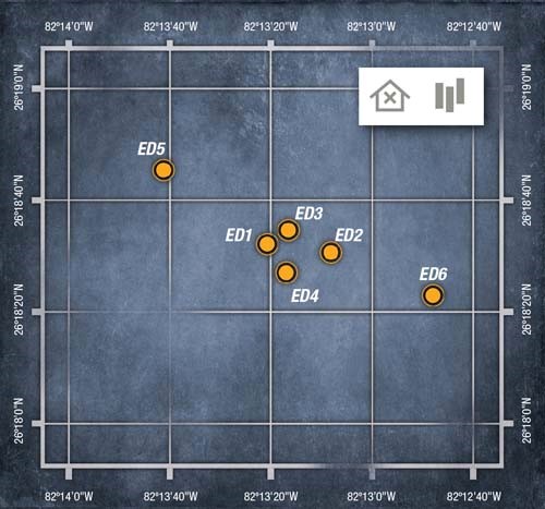 Individual Plots: ED1: 26-18.526N, 82-13.346W Bridge Rubble ED2: 26-18.503N, 82-13.138W Bridge Rubble ED3: 26-18.569N, 82-13.276W Bridge Rubble ED4: 26-18.444N, 82-13.284W Bridge Rubble ED5: 26-18.746N, 82-13.687W Bridge Rubble/Pilings ED6: 26-18.377N, 82-12.803W Bridge Rubble |